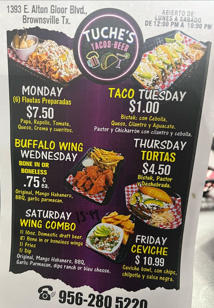 Welcome to Tuche's Tacos and Beer, a family-friendly gem nestled in Brownsville, TX. This inviting eatery is a taco lover's paradise, serving up an impressive selection of tacos and refreshing beverages. Guests rave about the robust flavors found in their bistek and ribeye tacos, but the standout has to be the shrimp gobernador—a culinary delight that leaves a lasting impression.